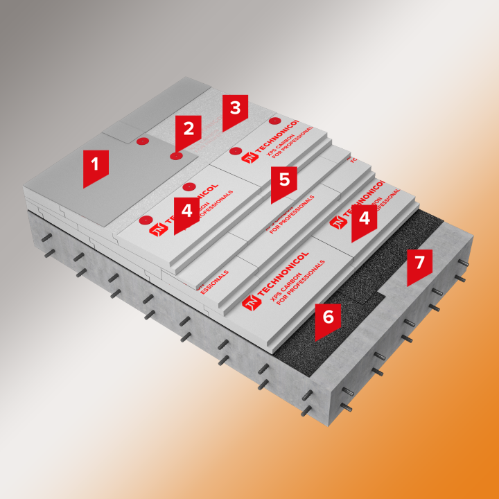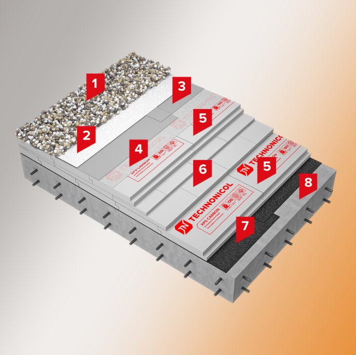Кровельный ковер выполняется из полимерной мембраны V-GR, армированная стеклохолстом, которая обладает повышенной устойчивостью на прокол. Для дополнительной защиты полимерной мембраны от проколов на неё укладывается иглопробивной термообработанный геотекстиль и только затем балластный слой. Для теплоизоляционного слоя применяется утеплитель на основе экструзионного пенополистирола. Между ПВХ мембранной и экструзионным пенополистиролом – стеклохолст. В качестве пароизоляции по бетонному основанию применяется наплавляемый материал Технобарьер.