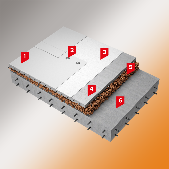 Кровельный ковер выполняется из полимерной мембраны V-RP, которая имеет высокие противопожарные характеристики – Г2, РП1 и В2, что позволяет применять систему без ограничений по площади кровли. Между цементной стяжкой и полимерной мембраной необходимо устройство из термообработанного геотекстиля. Для создания уклона по железобетонному основанию используется слой из керамзита, поверх которого устраивается армированная цементно-песчаная стяжка или укладка плоского шифера (АЦЛ) в 2 слоя с разбежкой по осям.