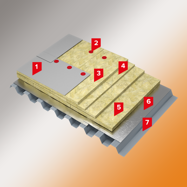 Кровельный ковер выполняется из полимерной мембраны V-RP, которая имеет высокие противопожарные характеристики – Г2, РП1 и В2. Для устройства теплоизоляционного слоя применяется две марки утеплителя на основе каменной ваты. Прочный утеплитель, применяемый для устройства верхнего слоя теплоизоляции, который перераспределят внешнюю нагрузку на нижний слой теплоизоляции. В качестве пароизоляции по профилированному настилу применяется алюминизированная мембрана Паробарьер С (А500 или Ф1000).